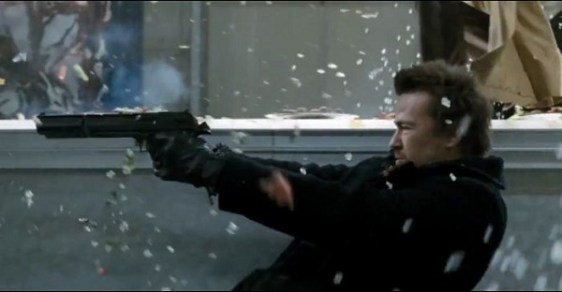 As for the Saints themselves, what can I really say? They’re back and doing their thing, and it’s basically the same as before, except they just look a bit more tired and deliver their awesome killing prayer (above) a lot more robotically. And while it seems Flanery and Reedus have aged about 15 years in the ensuing 10, Billy Connolly looks like he may have actually gotten younger, and the film tries to expand upon his character by giving Il Duce, the scourge of the Boston mob, his very own origin story. We can tell it’s a flashback because of the desaturated color (a trope I truly never get tired of), and Il Duce’s backstory is at least marginally interesting. Some mobsters killed his boss, he goes to kill mobsters, he realizes he likes killing mobsters, his buddy betrays him and then comes back for revenge (Yes, you read that correctly), and so on. There was a time when I might have found this story more compelling, but a decade and four seasons of Dexter later, all it inspired was a tepid yawn. His back story amounts to a fairly simplistic (and yet strangely incoherent) revenge and serial killer tale, and just comes off as padding a shallow film with needless exposition.