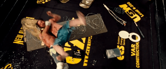 I mention my fandom for MMA because…steroid scandals notwithstanding…the action is real, and it’s a bloodsport. It’s gladiatorial combat, and my personal ethics on watching such things are an ongoing personal project. Every time a fresh spurt of blood hits the Octagon, after I’m done gasping and cheering, I think – Should I really be watching this? And then, I keep watching, because it’s awesome. And because they’re voluntary participants underpaid in a flawed and top-heavy economic system who are fighting by choice and for the twisted amusement of a decadent society that will thoroughly bill them for the healthcare they require afterward and…then I keep watching, because it’s awesome. But there is one type of semi-authentic, semi-scripted prize-fighting that has never made sense to me – a “hardcore match“, in which the wrestlers attack each other (and themselves) with dangerous-looking weapons, inflicting real (minor) injuries.