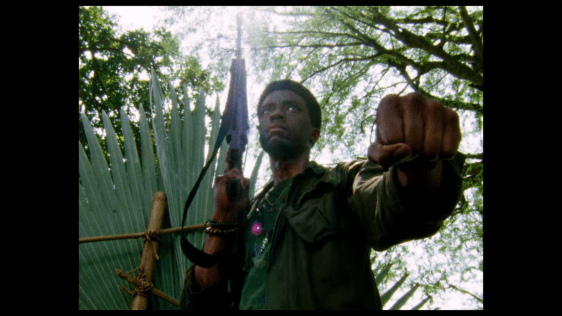 The Baldwin quote came to mind not just for its resonance with respect to Paul, but because of one scene in particular, layered with both visceral rage and brotherly love, in which Dr. King’s murder is revealed to the five main characters as they camp in the jungle. They are seemingly separated from any other unit or chain of command as they listen to a propaganda broadcast from Hanoi Hannah (Veronica Vanh Ngo), who is playing out a psychological warfare strategy of trying to persuade American G.I.s of the immorality of warfare, and trying to persuade black GIs in particular to give up the fight for a country that has never properly embraced them as full citizens. This scene feels both theatrical and plausible as it is playing out, with the five men seemingly just camped in the jungle with no specific mission, all played by men in their 50s and 60s (who aren’t quite old enough to play these characters in 2020), with the exception of then 42-year-old Boseman (who passed away from colon cancer in August). Norm is only partially in uniform, standing before a jury-rigged sunshade of ferns, and the camera floats over each man’s face as they take in this devastating news, fading back and forth over footage of King’s funeral procession and riots in over 100 American cities. Hannah continues, pointing out that black people are only 11% of the US population, but they represent 32% of the American troops in Vietnam – depending on the specific year, this seems to have been both a true statistic and a deliberate strategy by the US government, and Hannah suggests that they should go home and fight where they are really needed.